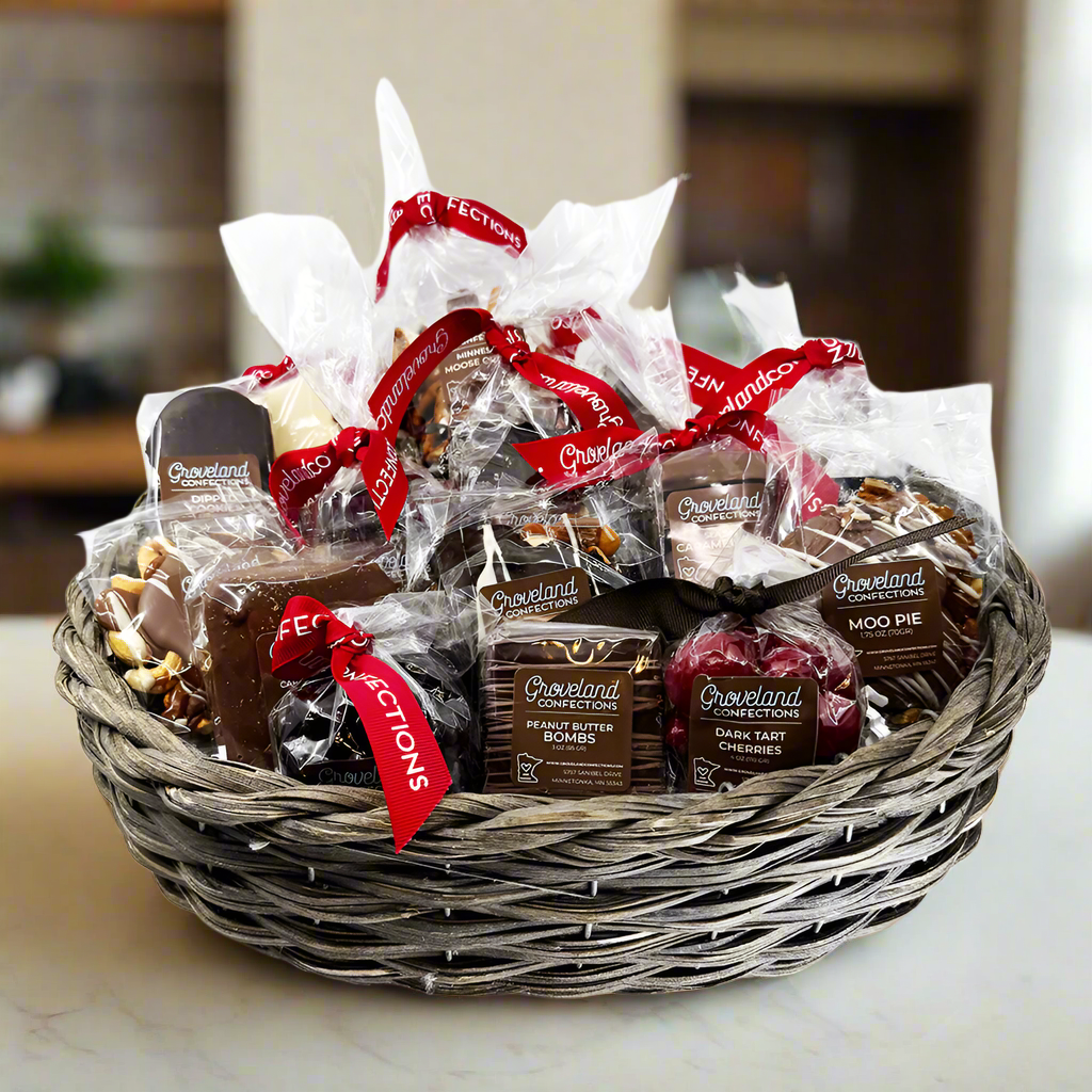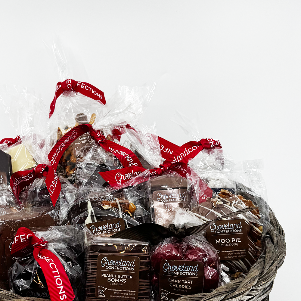Small version of our larger “Love From Minneapolis” in our beautiful wicker basket chocked full of our signature treats, like Caramel Bars, Moo Pies, Designer Barks and more!