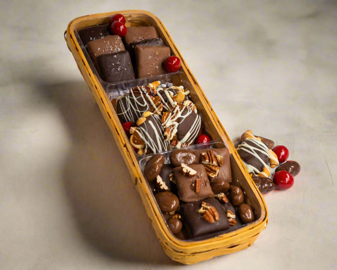 Discover the Twin Cities Trio, a delightful selection of our finest treats. This three section wicker tray features our signature toffee, creamy caramel, and our beloved Loon Pies, perfect for any occasion. Indulge in the taste of Minnesota's best confections!